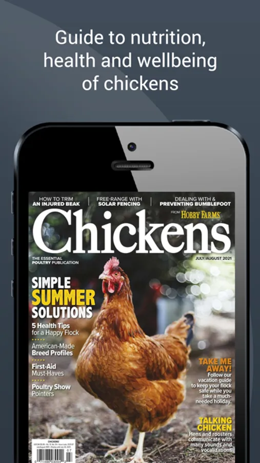 Chickens, a bimonthly magazine from the editors of Hobby Farms, provides expert advice about the nutrition, health, care and comfort of keeping a single backyard bird or a large country flock, as well as the care, collection and consumption of their eggs and meat. Each issue includes profiles of chicken keepers, coop maintenance and design tips, poultry breed descriptions, predator prevention ideas, health and nutrition articles, recipes, and news related to America’s favorite livestock. Chickens magazine targets people involved in the care and raising of chickens and other poultry, for eggs and meat or simply as pets, including country farmers, hobby farmers, urban farmers and everyone in-between.