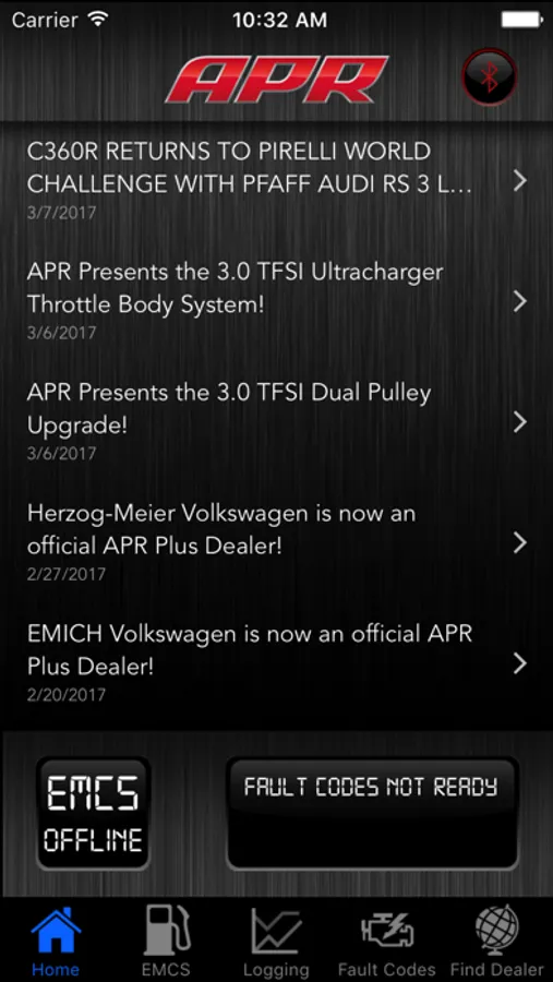 APR Mobile installs on the iPhone, iPad, or iPod and provides a wireless connection to the vehicle’s engine control unit or ECU. Once connected through APR’s required Bluetooth dongle and flashed with the required and compatible APR ECU Upgrade, APR Mobile can be used to access APR’s EMCS program switching features, read and clear fault codes and data log the ECU at high data rates. The app can also be used to access APR’s latest news articles, locate dealers in APR’s network and review previously saved data logging sessions.