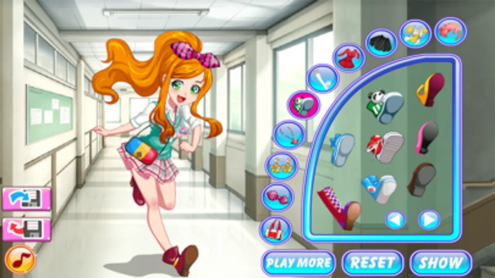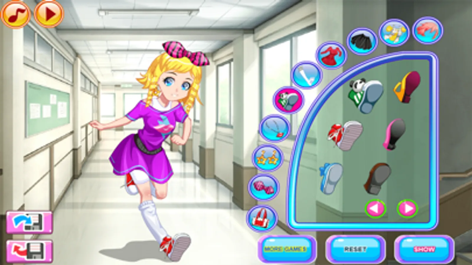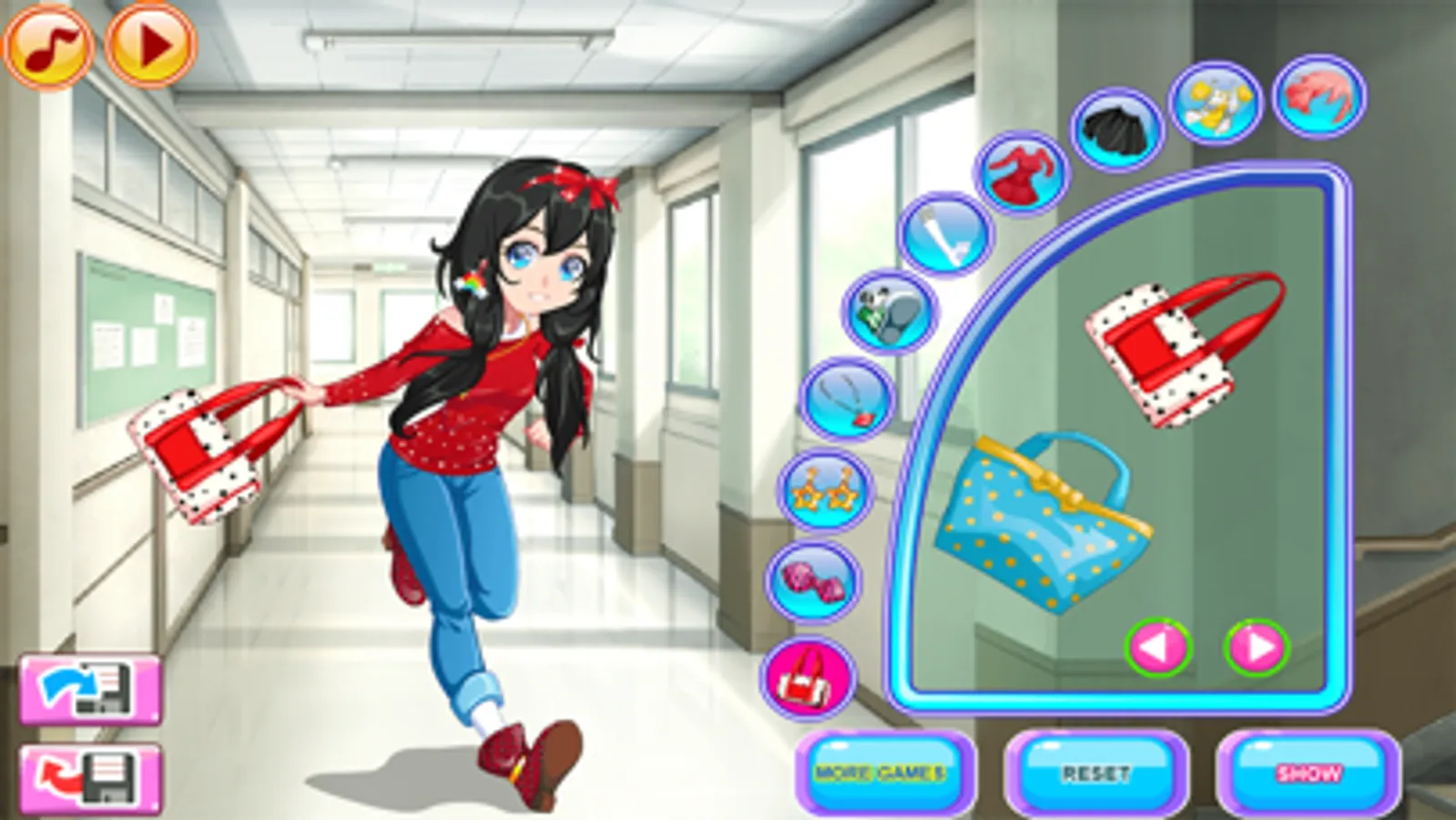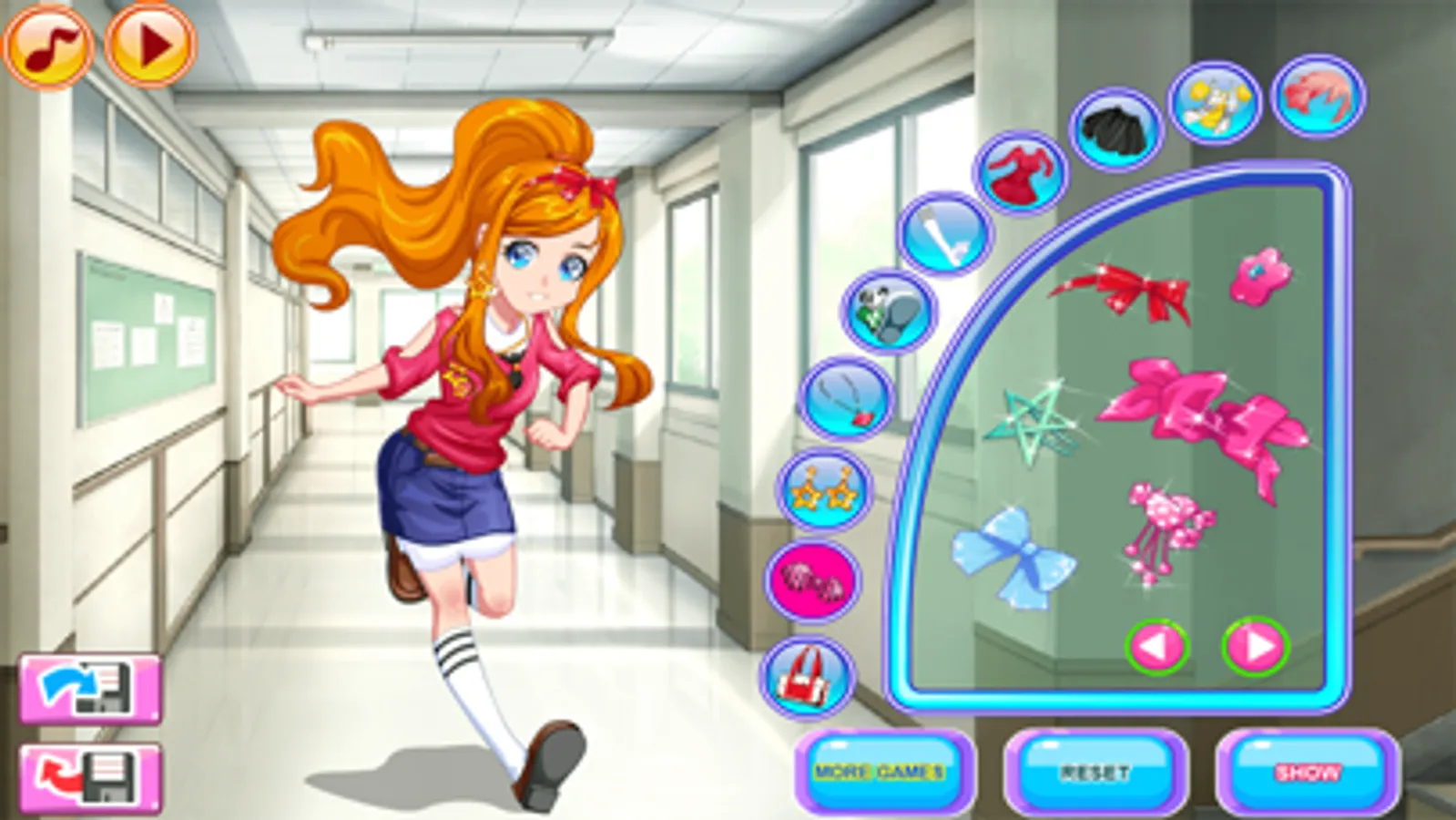 Have you ever been late for class and didn't have time to choose the perfect outfit to show off to all your friends? Well with the Late For Class makeover game you can be stylish when late for class! Here you can choose between 7 different category icons to change her hair, shirt, pants, dress, socks, shoes, necklace, earrings, hair accessories, and handbag! By clicking on each one and toggling through the options, you can create the perfect outfit that will definitely impress when you walk into that class room! Release your inner fashion designer and create the perfect outfit when late for class in this fun makeover game.