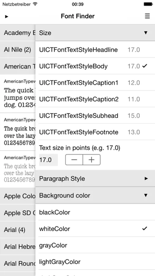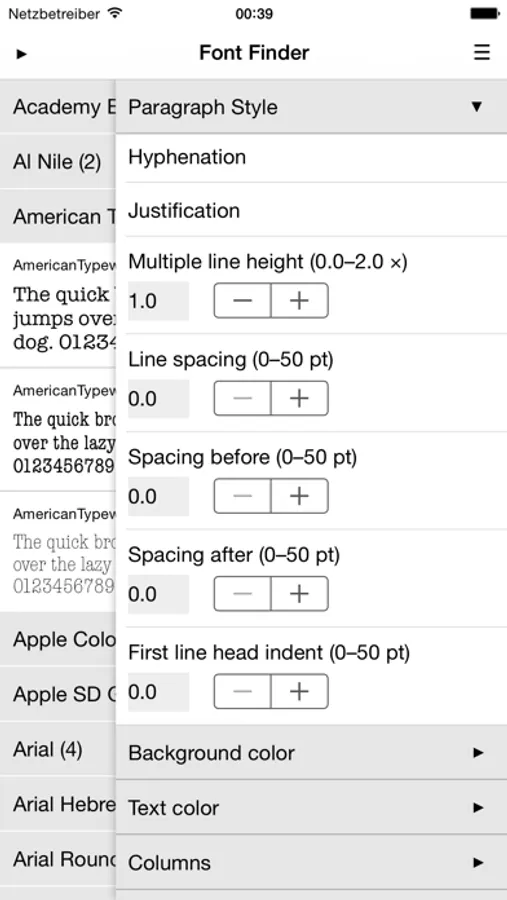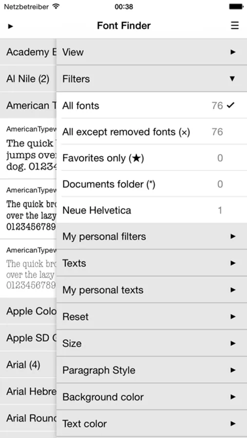 Different filters help you to hide those fonts you are not interested in and emphasize your favorite ones. In addition, size as well as the background and text color can be choosen or defined at will. Try the new iOS 7 Text Kit styles such as justification, automatic hyphenation, different line spacing and indentation of the first line and much more. The current setting is automatically loaded the next time you start the app.