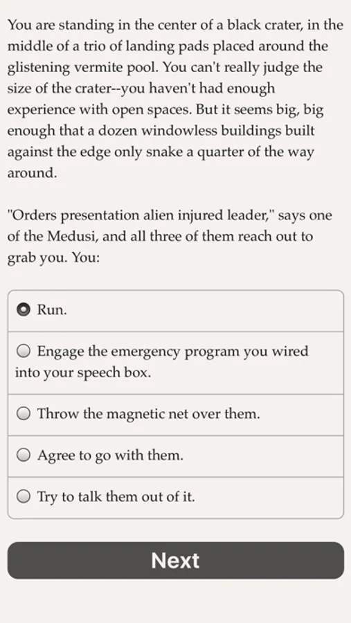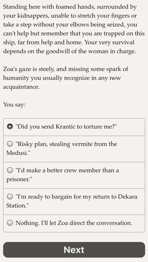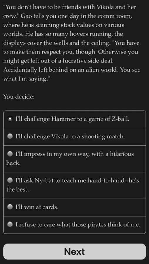 Will you survive the infamous space-slime pits? Will you earn the respect of the crew, or even start a romance with a space pirate? Can you negotiate with the fungoid aliens, despite linguistic and cultural barriers? Or will you blast their rubbery guts, plunder the slime pits, and retire in luxury?