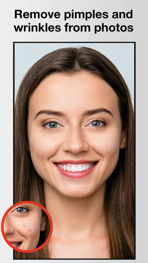 Erase pimples and smooth out pores in seconds! Remove wrinkles from your photo and take years off your age! Simply drag your finger over pimples, wrinkles, moles, scars, and other blemishes to make them disappear. Pimple & Wrinkle Eraser works with all skin tones, and is great for simple touch ups, or glamorous magazine style edits.