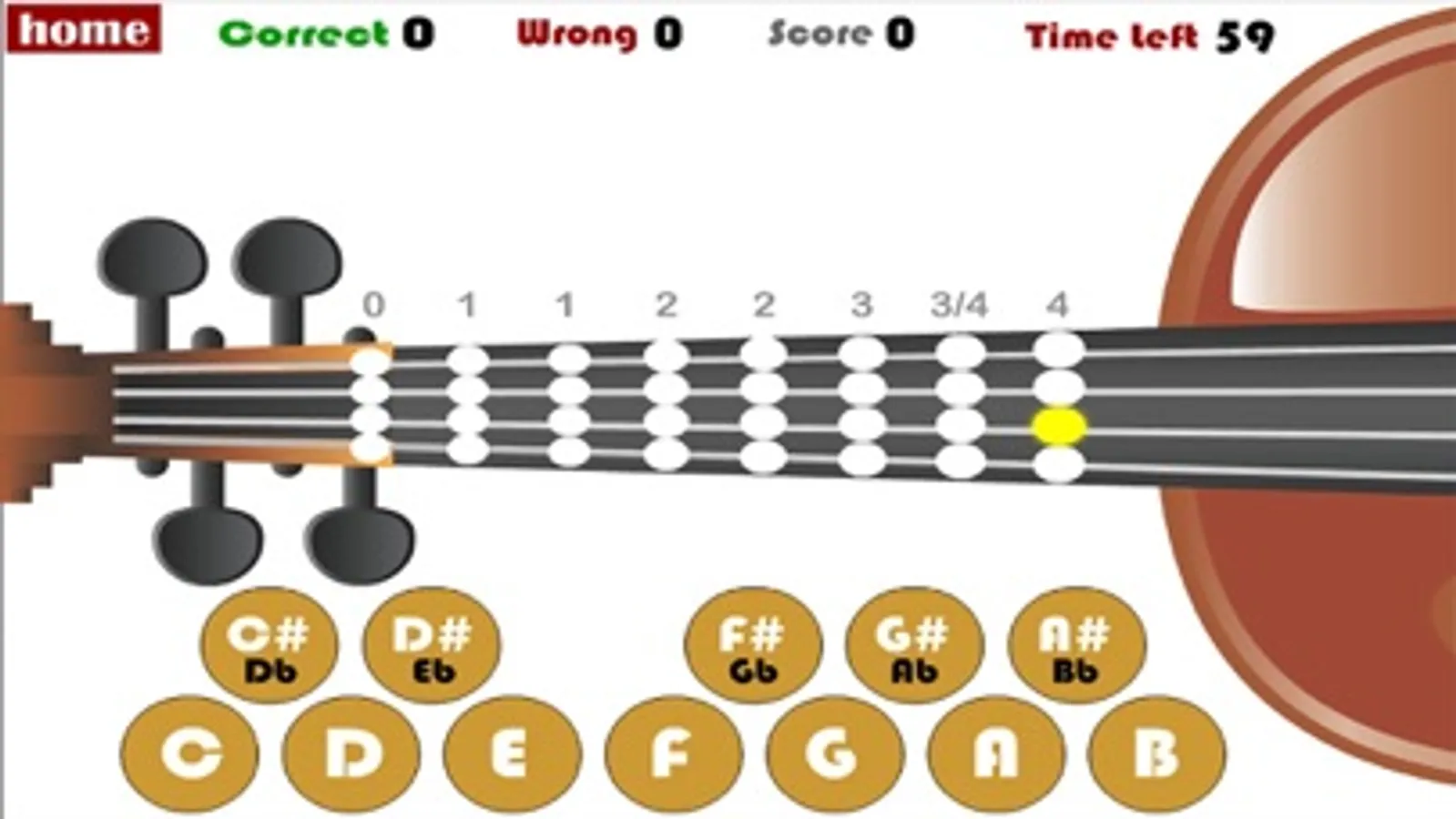 Here's how it works. First an indicator will be displayed on the fingerboard randomly on any of the 4 strings. Your job is simply to select which note you think it is.