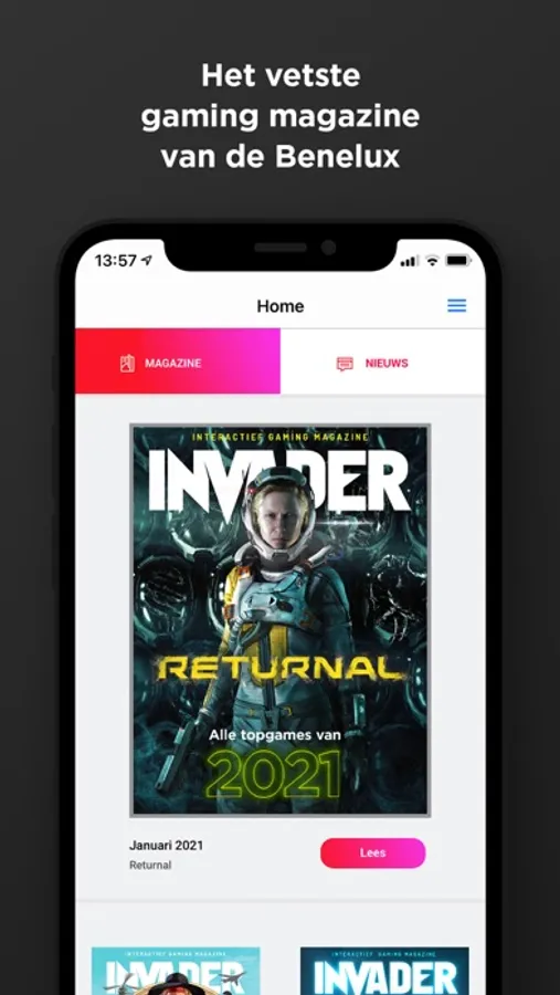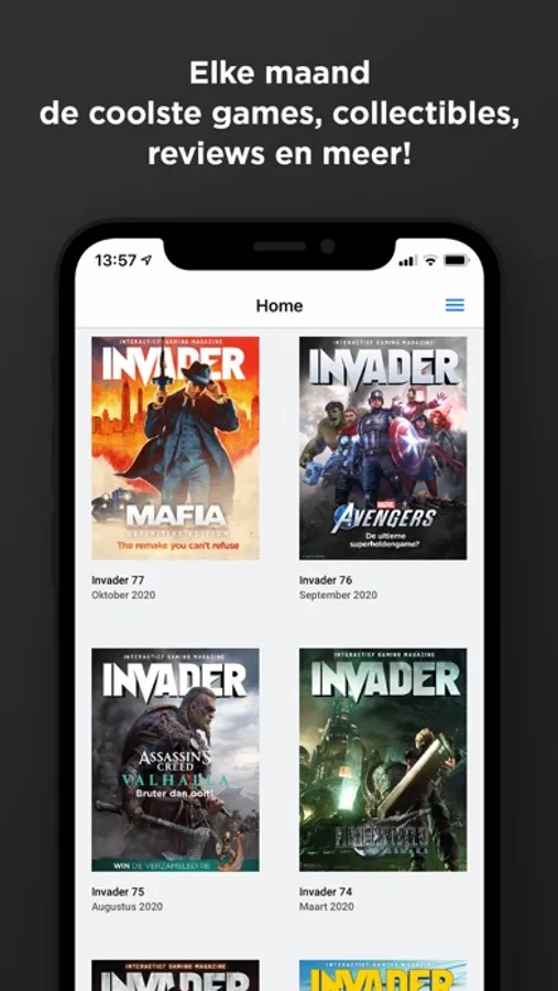 Invader is het vetste gaming magazine van de Benelux. Op maat gemaakt voor smartphones en tablets, helemaal interactief en helemaal gratis. Elke maand krijg je het vetste gamenieuws, de leukste video’s, coole previews en eerlijke reviews van de nieuwste gametoppers. Aangevuld met een stevige dosis gadgets en geek stuff. Ongemeen interessant en ook nog eens geweldig interactief.