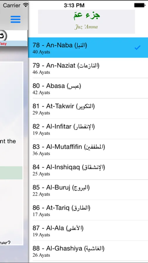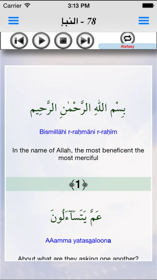 This application contains Juz Amma -جزء عمّ- (Last chapters of the Noble Quran). Each sura is displayed with its original verse (in arabic) and also with its translation and transliteration so as to facilitate learning for non-arabic speaking people.