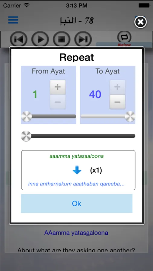 Many reciters are available and it is also possible to repeat a range of Ayats in order to help memorization.