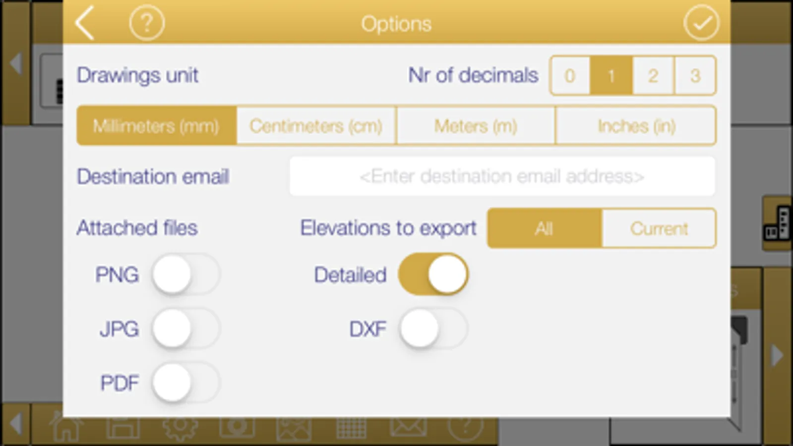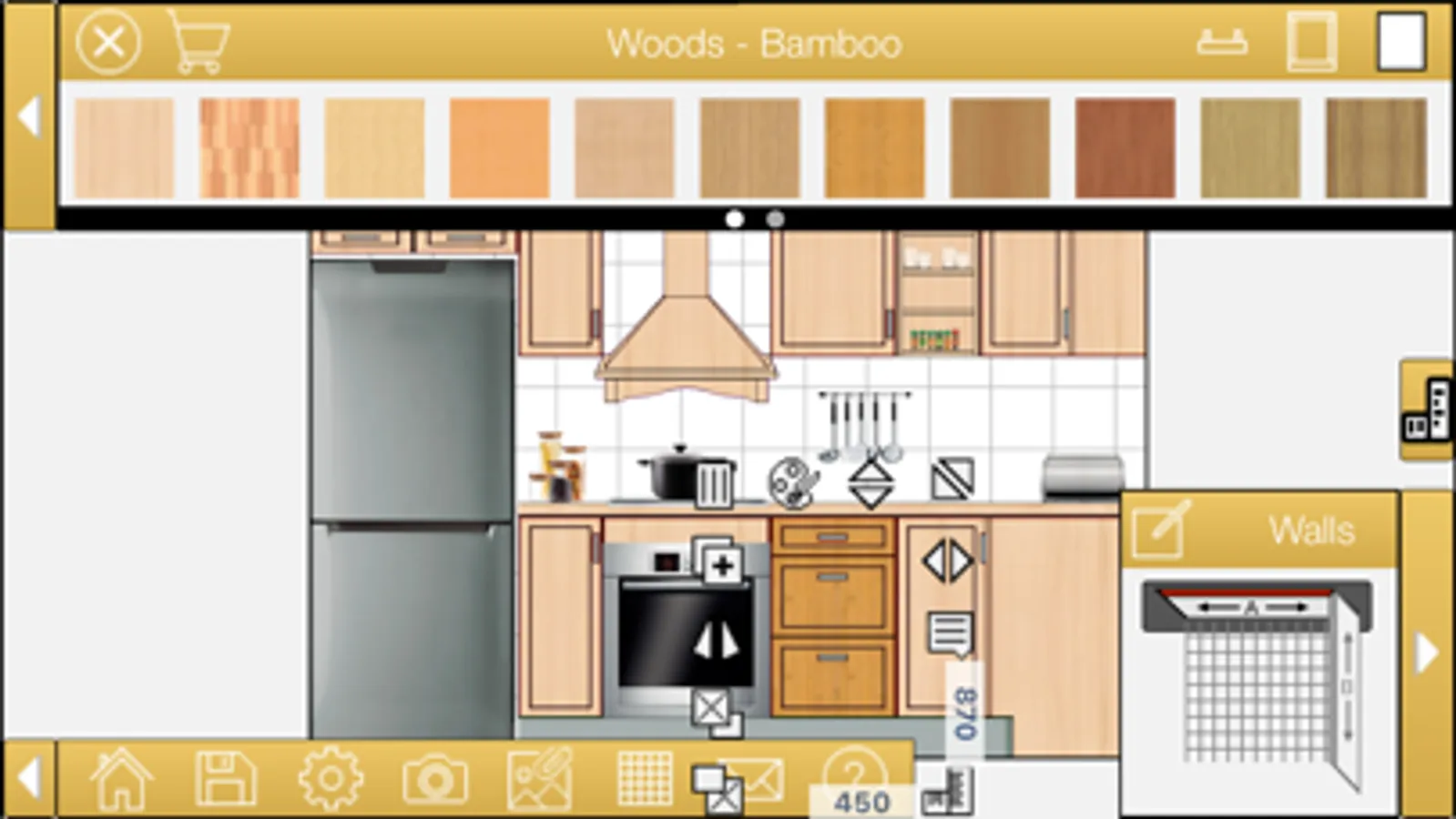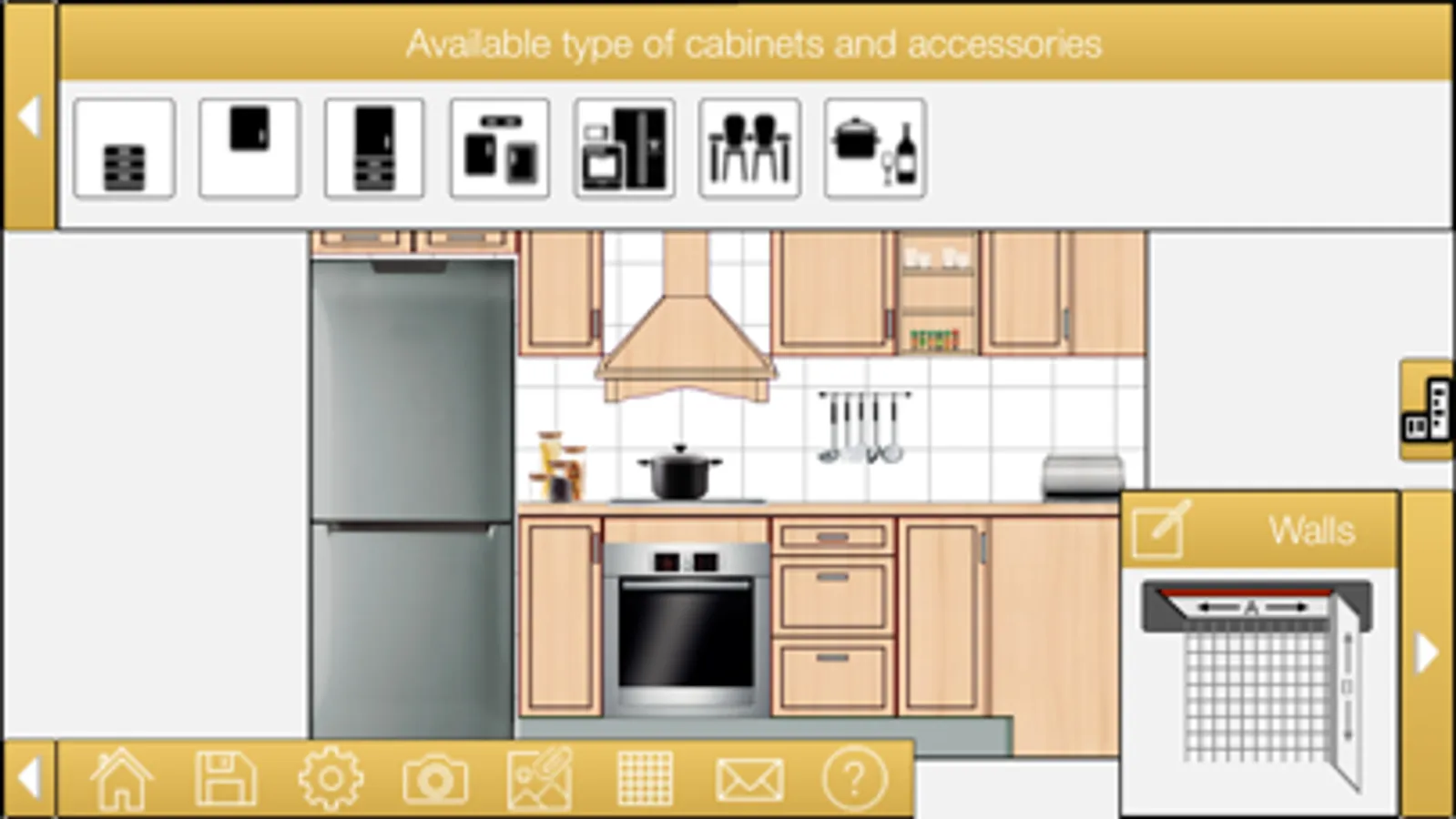 Design a kitchen with your iPad, iPhone and iPod, inserting items in the front view of each one of the room walls. Insert cabinets, appliances and accessories. Select materials and finishes among woods, colors and accessories. Save your designs in your device or email them in ".pdf", ".png", ".jpg" or ".dxf" format.