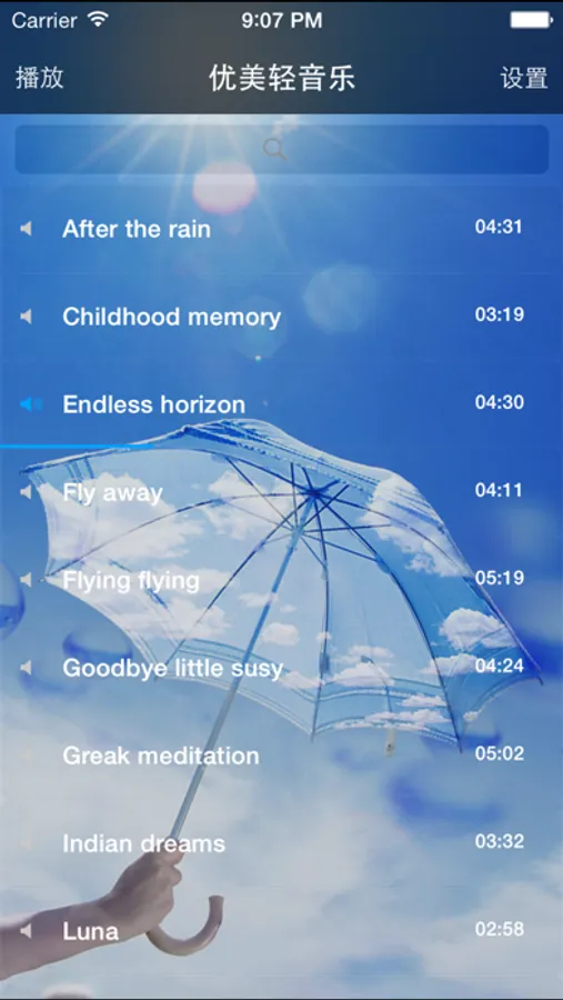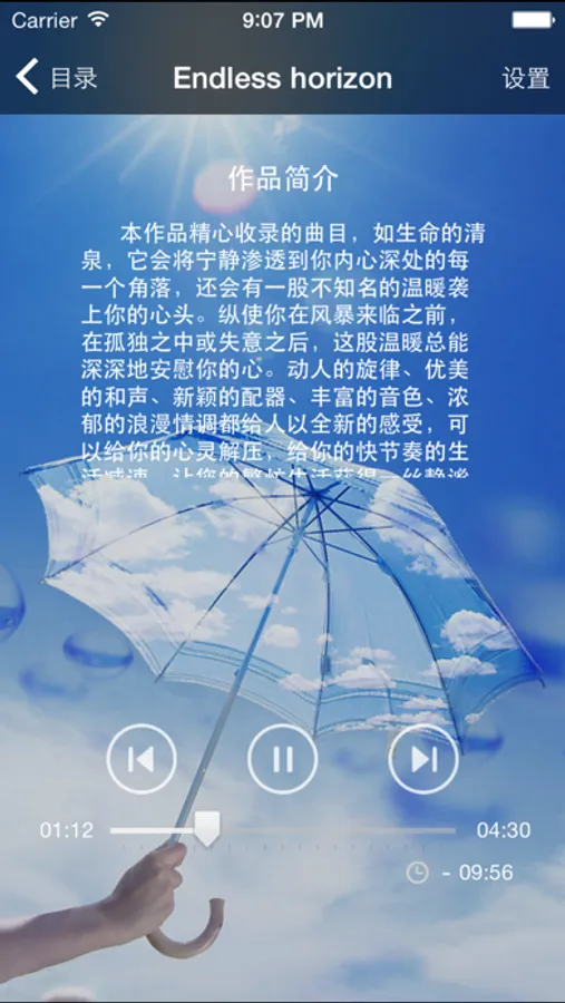 有时间听听本应用吧,特别是忙碌一天的上班族,在轻音乐中你会发现,在这喧嚣的都市中,让身心获得一份宁静是多么的舒适与幸福。单纯的轻音乐,能让人放松精神,让浮躁的感觉远离自我。在各种轻音乐中,人们越来越倾向于往其中加入一些自然元素,如流水声、水中的蛙声、柔软的风声、如阳光般温和的钢琴声。 听着本应用的自然音乐时,眼睛轻轻闭上,思维如入无人之境,自己仿佛置身于宁静的大自然中,身边没有任何嘈杂,心中的杂念一下子都沉入心底,又不觉间消失得无影无踪,心灵补品:耐人寻味的轻音乐