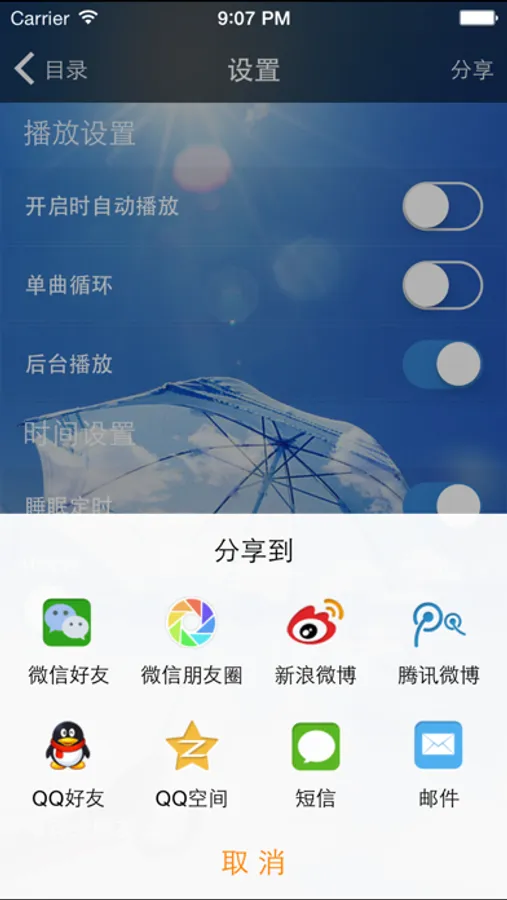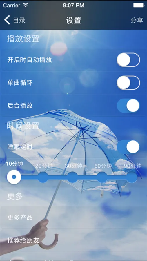 4.睡眠定时:设定自动关闭播放时间,到时自动关闭播放。