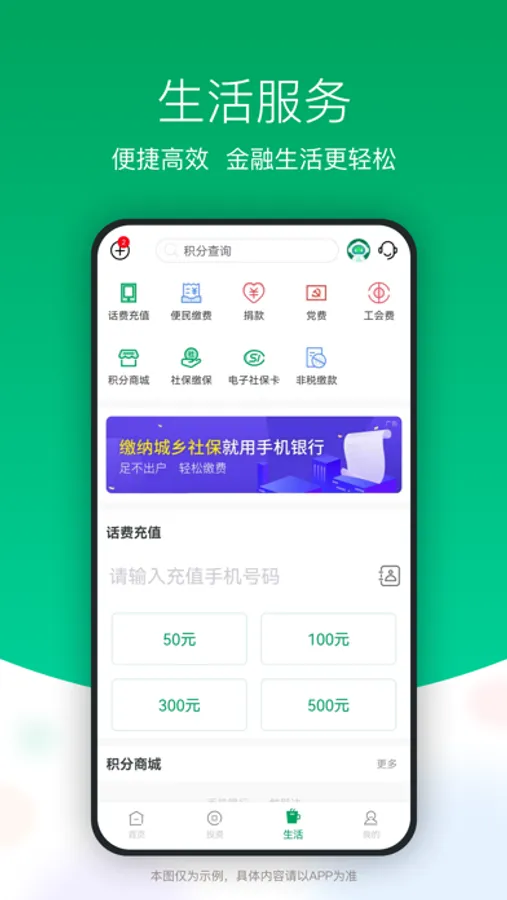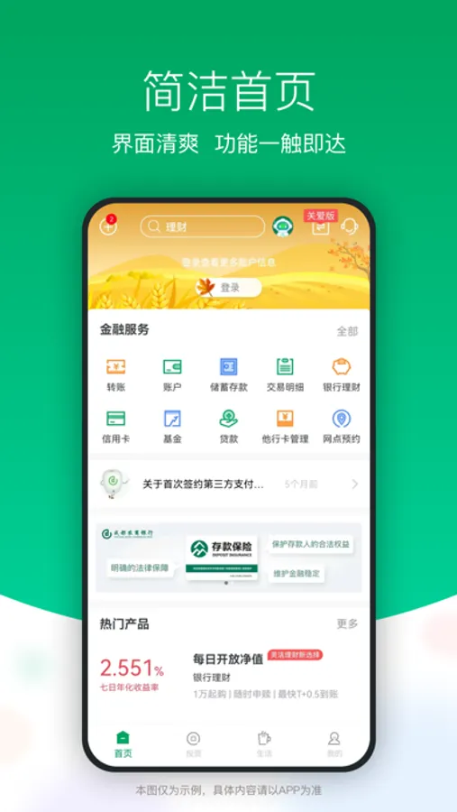 成都农商银行手机银行个人版是成都农商银行专为个人客户量身定制的移动金融服务平台。秉承以客户为中心的理念,提供丰富的移动金融服务,注重客户体验,打造便捷、友好、贴心的使用体验。提供账户管理、资产视图、转账汇款、信用卡管理、投资理财、贷款、网点预约等金融服务;提供蓉e付、社保卡激活、社保缴保等特色业务;提供话费充值、燃气费、水费、积分商城等生活服务,让您所需的金融和生活服务,一触即达。