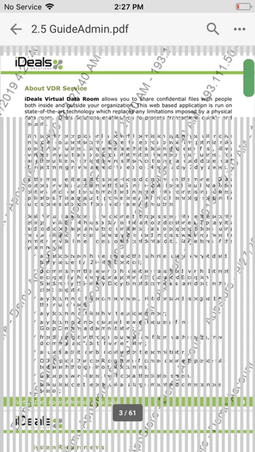iDeals Virtual Data Room mobile app is a simple and lightweight application that functions well without compromising any of its security features. Documents are viewable on the mobile device and are protected by watermarks. No footprint is left on the mobile device when accessing the file. You can be assured that if the device is stolen or lost, no one can recover confidential data from your device.
