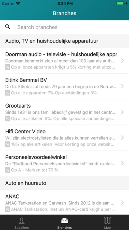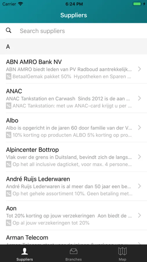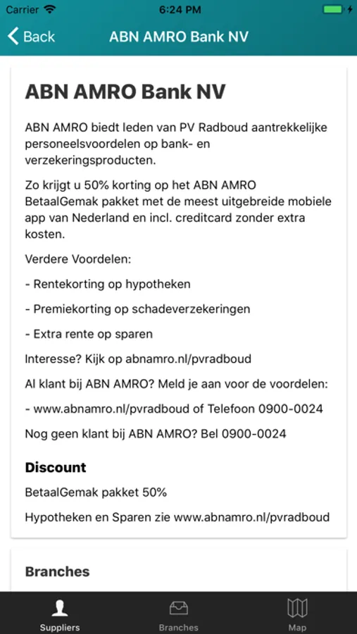 Quickly search for suppliers that offer discounts to members of PV Radboud. You can look for suppliers in alphabetical order, or in categories. You have the option to directly email or phone a supplier form Discount PV Radboud. The application is available in Dutch and English; it adapts automatically to the language setting of your mobile device.