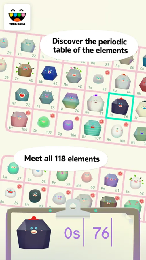 Welcome to Toca Lab: Elements! Explore the colorful and electrifying world of science and meet all 118 of the elements from the periodic table.