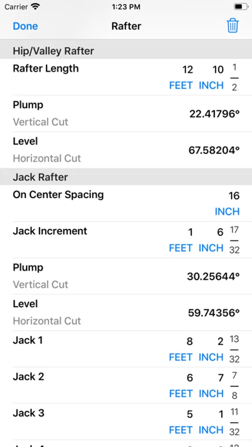 - Rafter Module: Enter any two of the four parameters, Rise, Run, Diagonal, or Pitch to calculate the unknowns. Run, Rise, and Diagonal values can be entered in Feet, Inches and Inch fractions or Decimal Feet and Decimal Inches. Pitch can be entered as a dimension in inches which is the amount of rise over 12 inches of run. Furthermore, Pitch can be entered as an angle in degrees, a percent grade or slope (pitch ratio). Tap on any of the values to see its conversion to other formats. In addition to Common Rafter, you can perform calculations of Regular and Irregular Hip/Valley and Jack Rafters. You can also calculate Plump and Level cut angles. Simply enter known values of Common Rafter and you are done. Length and cut angles of the adjoining Hip (or Valley) rafters, Incremental Jack Adjustment, Regular/Irregular Jack Rafter Lengths and Cut Angles for 16 Inch On Center Spacing are all automatically calculated. You can also enter an On Center Spacing other than 16 Inches.
