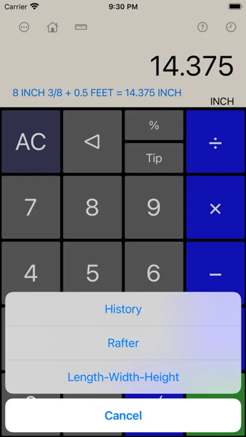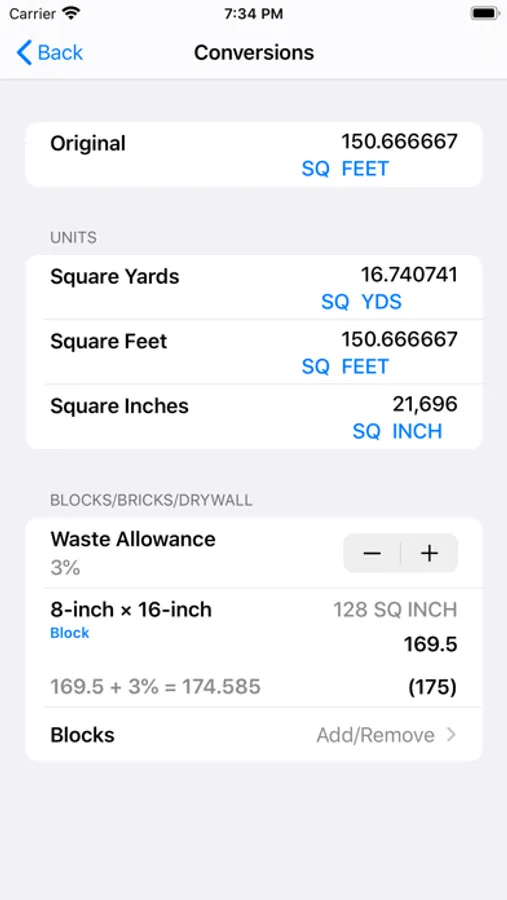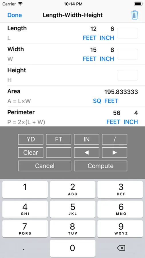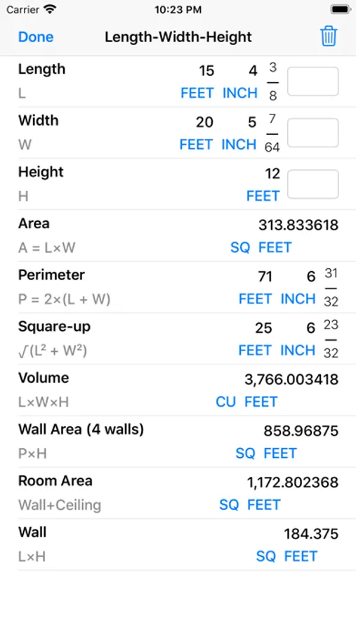 - Length-Width-Height Module: You can enter Length, Width, or Height values in Yard-Feet-Inch-Fractions, Decimal Feet, Decimal Inches, and Yards. Enter the Length and Width to calculate Area, Perimeter (of a room), and Square-up. In addition, enter the Height to calculate the Volume, Wall Area, and Total Room Area. You can enter any single length value and convert it to other dimensions, for example from Feet-Inch-Fractions to Decimal Feet or Decimal Inches or back. Furthermore you can tap on any calculated dimension to convert it to other dimensions. If the calculated value is Volume you can tap and see its conversion to Board Feet.