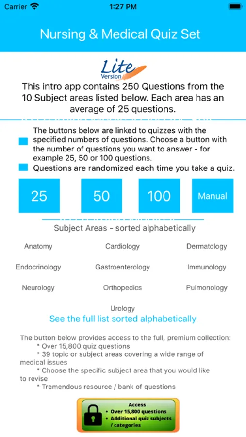 The free section of the app contains 250 questions from the 10 Subject areas below. Each area has an average of 25 questions - multiple-choice and true/false questions.