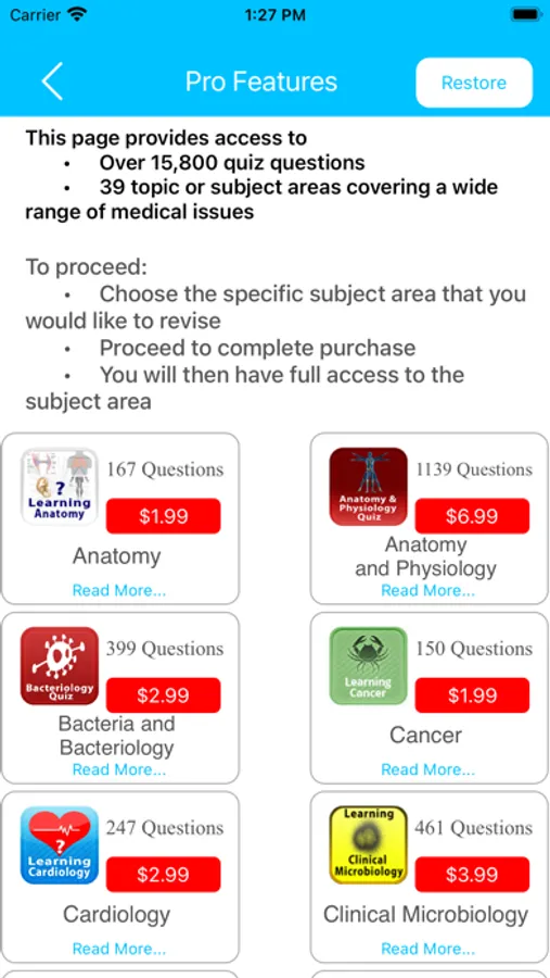 The professional app / paid version offers access to hundreds of questions organized into different categories. Questions are broken down into individual subjects or categories so you can test yourself on each subject area separately (as needed). This is a tremendous resource that will help you effectively review and test your knowledge.