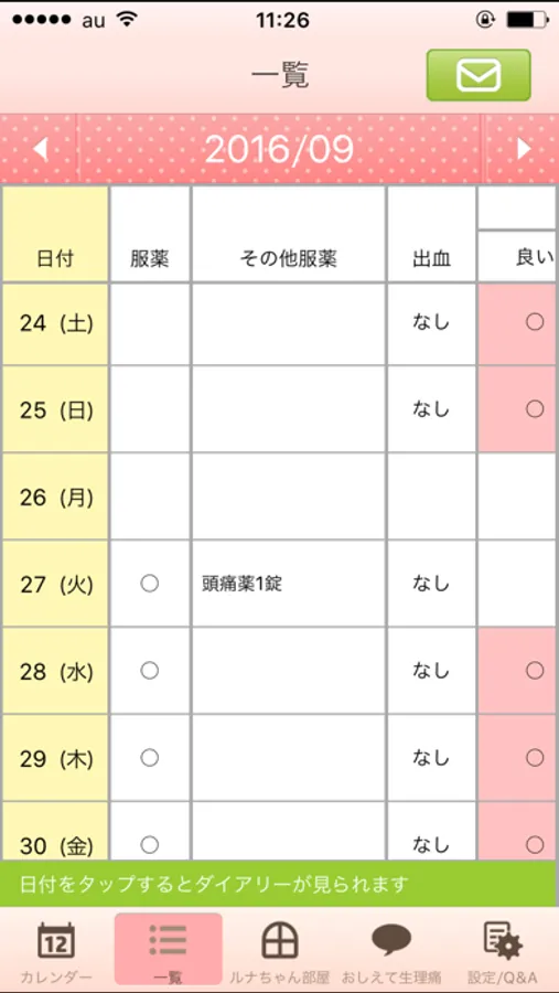ルナベルの服薬記録以外にも、頭痛薬やサプリメントなど、日常的に飲んでいるものを記録し一覧で確認できるので、振り返りがとても簡単です。記録したデータをメールに添付して送れるので、診察時にも役立ちます。