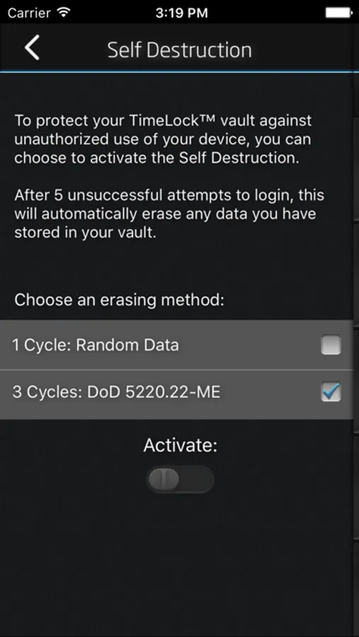 Should you lose or have your device stolen, do not worry about the protection of your photos and videos stored in TimeLock™: Self-destruction of TimeLock™ can be activated, to automatically delete all saved data in it after 5 incorrect passcode entries. It is not just simply deleted, instead the entire contents of the safe is securely overwritten.