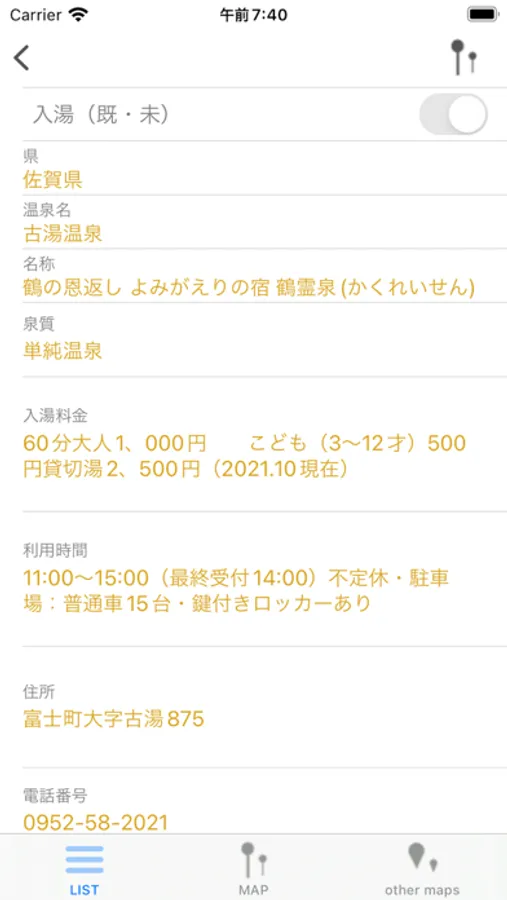 ②詳細リストからの個別温泉MAP表示