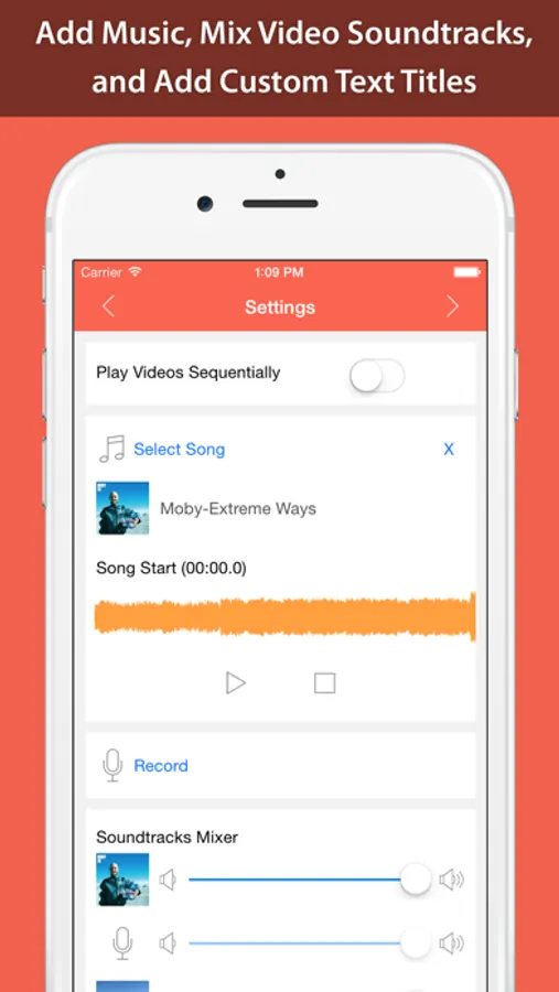 • Mix the soundtracks like a DJ with individual volume controls for each video and for the selected song;