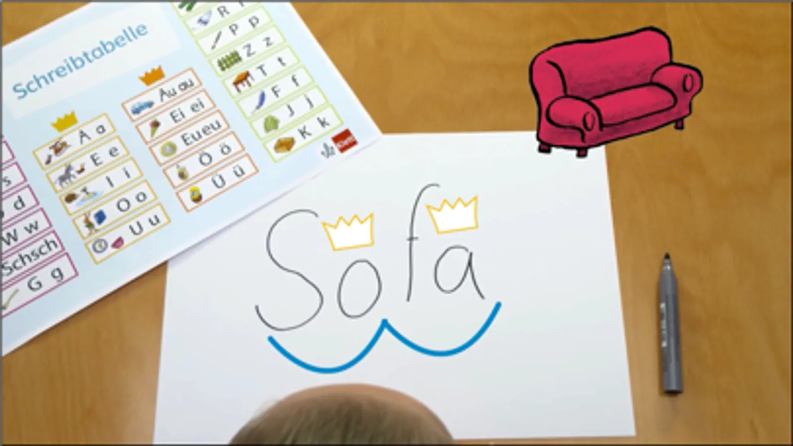 the children can compare and recognize mistakes. Basic orthographic awareness is practiced in a playful way.