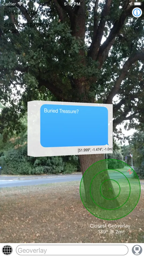 Geoverlay uses ARKit to show your Geotxt as a 3D object that appears to be part of your world.
