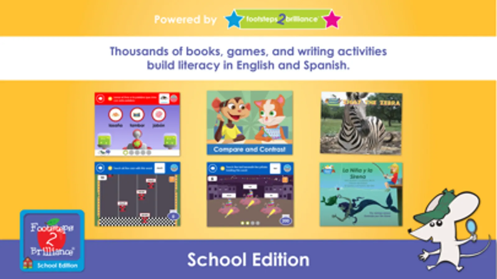 With our eBooks and games available in English and Spanish, Footsteps2Brilliance®, Inc. is the most flexible bilingual program around. With audio support, clear and simple instructions and checks for understanding, Footsteps2Brilliance®, Inc. is ideally suited to meet the needs of English Language Learning (ELL) students.