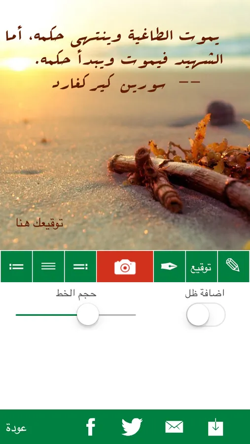تستطيع مشاركة الاقتباسات من خلال تويتر ، فيسبوك ، البريد الالكتروني كما يمكنك حفظها على جهازك لمشاركتها من خلال انستجرام و واتس اب