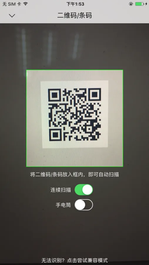 条码助手提供了两种模式的扫码能力:普通模式速度快,兼容性模式识别条码多。选择适合你的扫码模式,再也没有扫不动识别不了的条码。支持QR二维码,Code39,Code128,EAN-8,EAN-13,UPC-A,UPC-E,Codabar等格式条码识别制作。