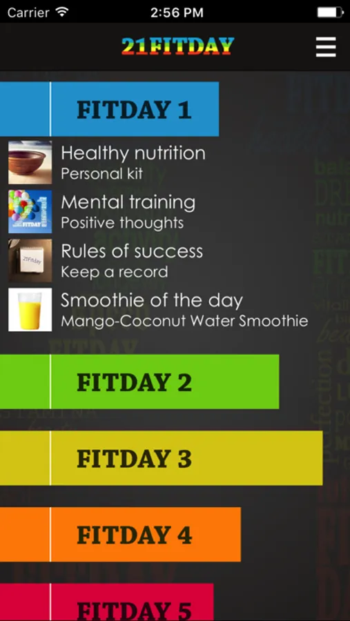 - 5 Fitday, 5 step for health life, 5 mental trainings, 5 rules of success, 5 recipes of smoothie and bonus 20 useful products for your body;