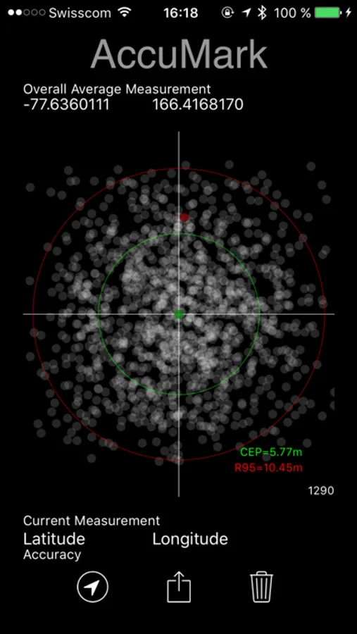This is not your average GPS averaging app! AccuMark allows you to capture location events from your iOS device and average them over time. GPS location fixes are subject to various error factors. However, over a period of several hours, measurement errors have a tendency to cancel each other out. Depending on the measurement duration, local GPS reception conditions and solar activity, the achieved final accuracy can be less than one meter/yard. Please note that there is no guarantee on the final accuracy.
