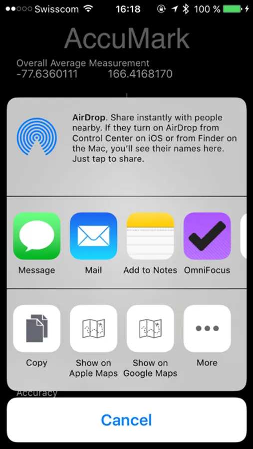 To use AccuMark, position the iOS device at the location for which you would like to determine the coordinates. Then press the location button. The button will highlight to indicate that the application is taking samples. AccuMark plots all samples in the plot area. AccuMark will only consider samples that fall into a circle with a diameter of 20 meters for averaging. If you press the share button, you have the option to show the location on Apple Maps or Google Maps, or to copy it to the clipboard. You can also share the raw location samples as a comma-separated-values file.
