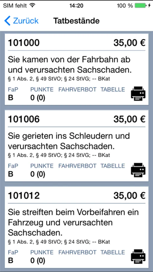 Mit dieser App kann der Bundeseinheitliche Tatbestandskatalog gesichtet und durchsucht werden. Ferner besteht die Möglichkeit, über einen angeschlossenen Bixolon Bluetooth Drucker SPP-R200II Tatbestände zu drucken.