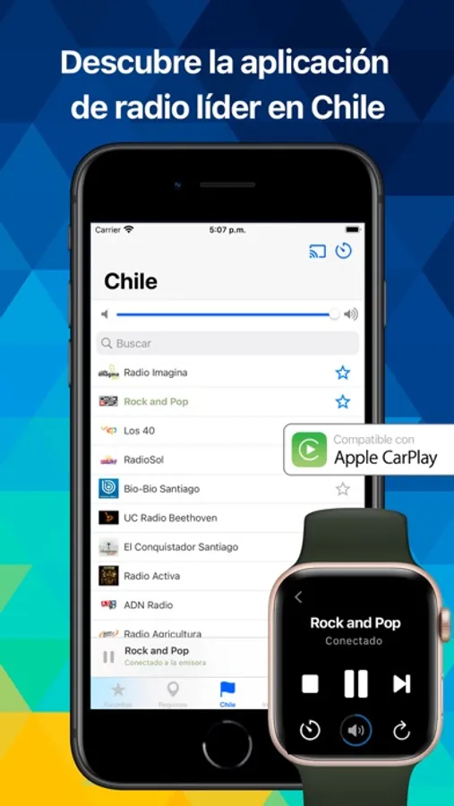 ¿Quieres una app de radio gratis que funcione bien y sea sencilla de usar? ¡Aquí la tienes! Radio Chile es compatible con tu Apple Watch (funciona con altavoz y auriculares), soporta Chromecast y conecta con CarPlay de forma nativa y gratuita. ¡Y te regalamos la mayor recopilación de emisoras chilenas que verás en cualquier app de radio!