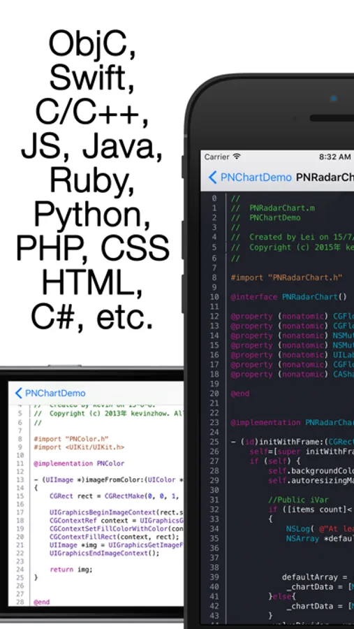 App support 60+ programming languages, like Swift, C, C++, JS, ObjC, C#, HTML, XML, Java, Python, Ruby etc.