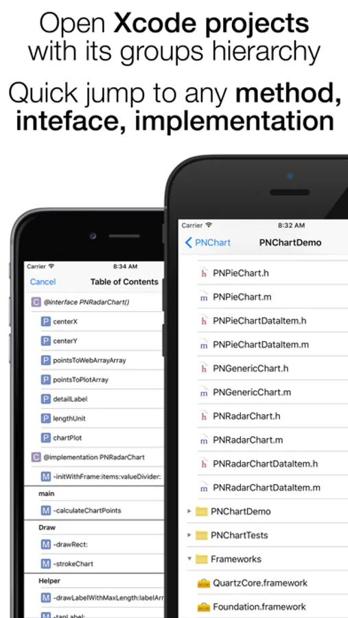 In each header or source file, you can use Table of Contents, for fast jump to any method definition, interfere, protocol or property declaration, #define constant. We also cheek your #pragma marks, to group your methods.