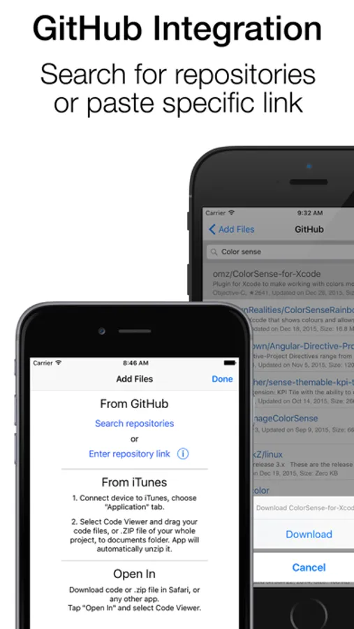 Just drag your files to app through iTunes, or download/search files directly from GitHub. Just past a link to repository like github.com/AFNetworking/ or search for repository by name. Also you can "Open In" any file in Code Viewer from Safari or any other app.