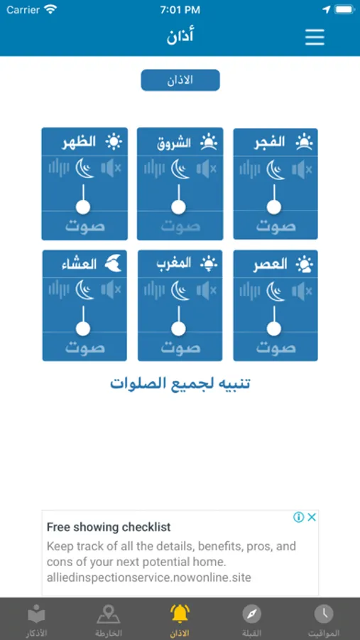•تنبيهات خاصة بالصلوات يمكنك ضبطها لكل صلاة على حدة وهي: تنبيه بالأذان ــ تنبيه قبل الأذان ــ تنبيه بإقامة الصلاة