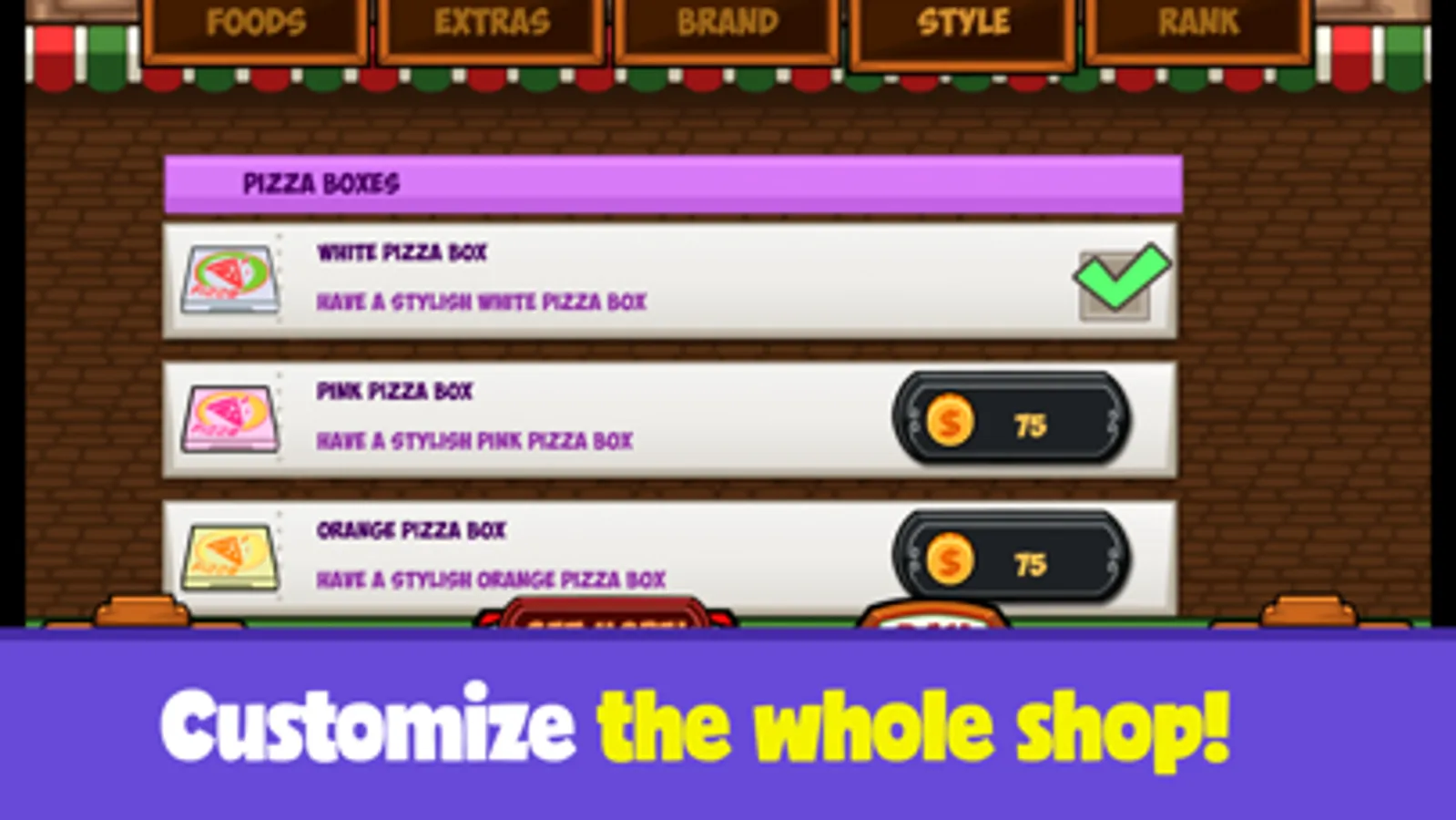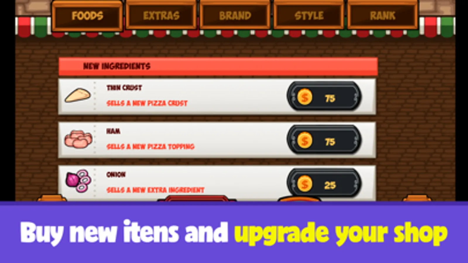 Earn coins with every sale and buy new ingredients, drinks and even new items to customize your pizza shop and make it even better, just the way you want! Paint the walls, change the floor, buy new trays and pizza boxes, lights and much more!