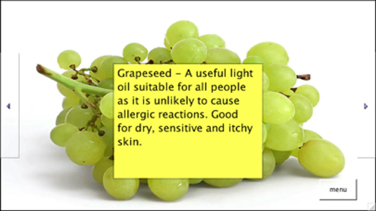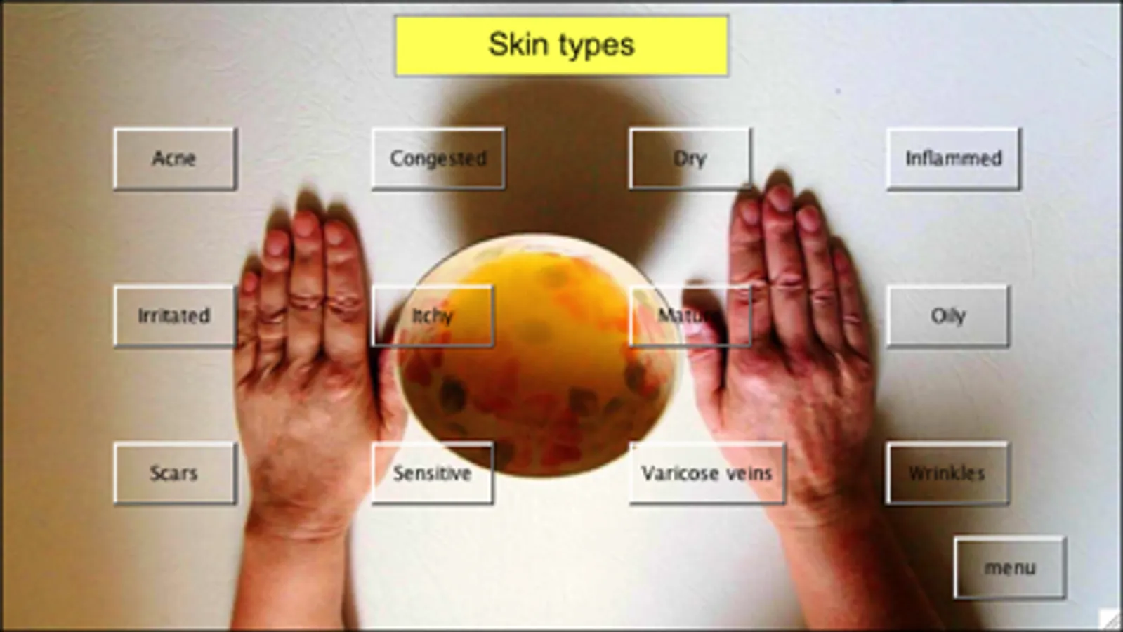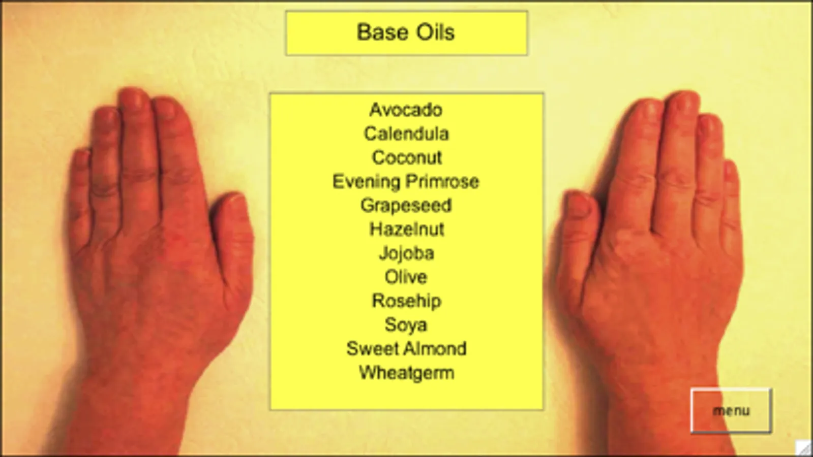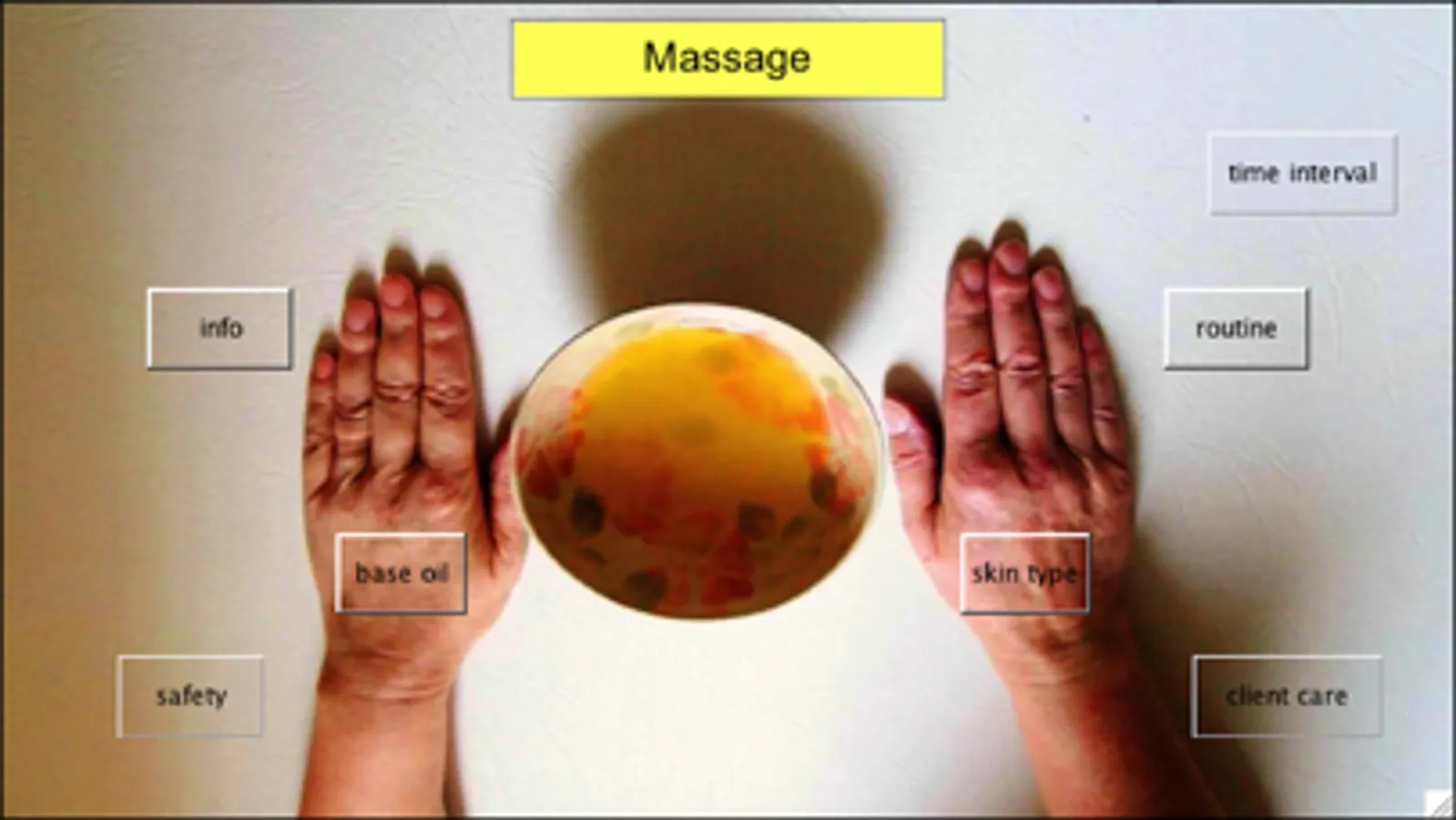 This App is designed for the Massage Therapist. It provides information on the choice of base oils from the client's skin type and client care.