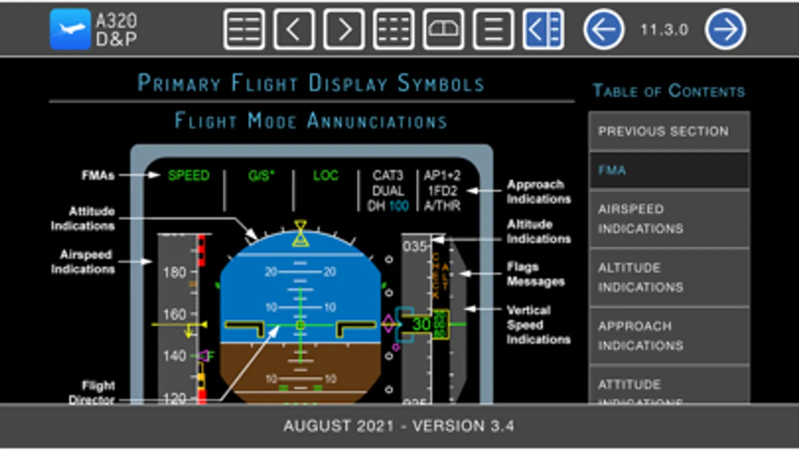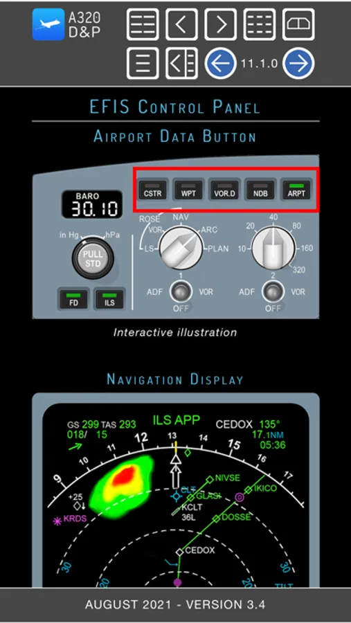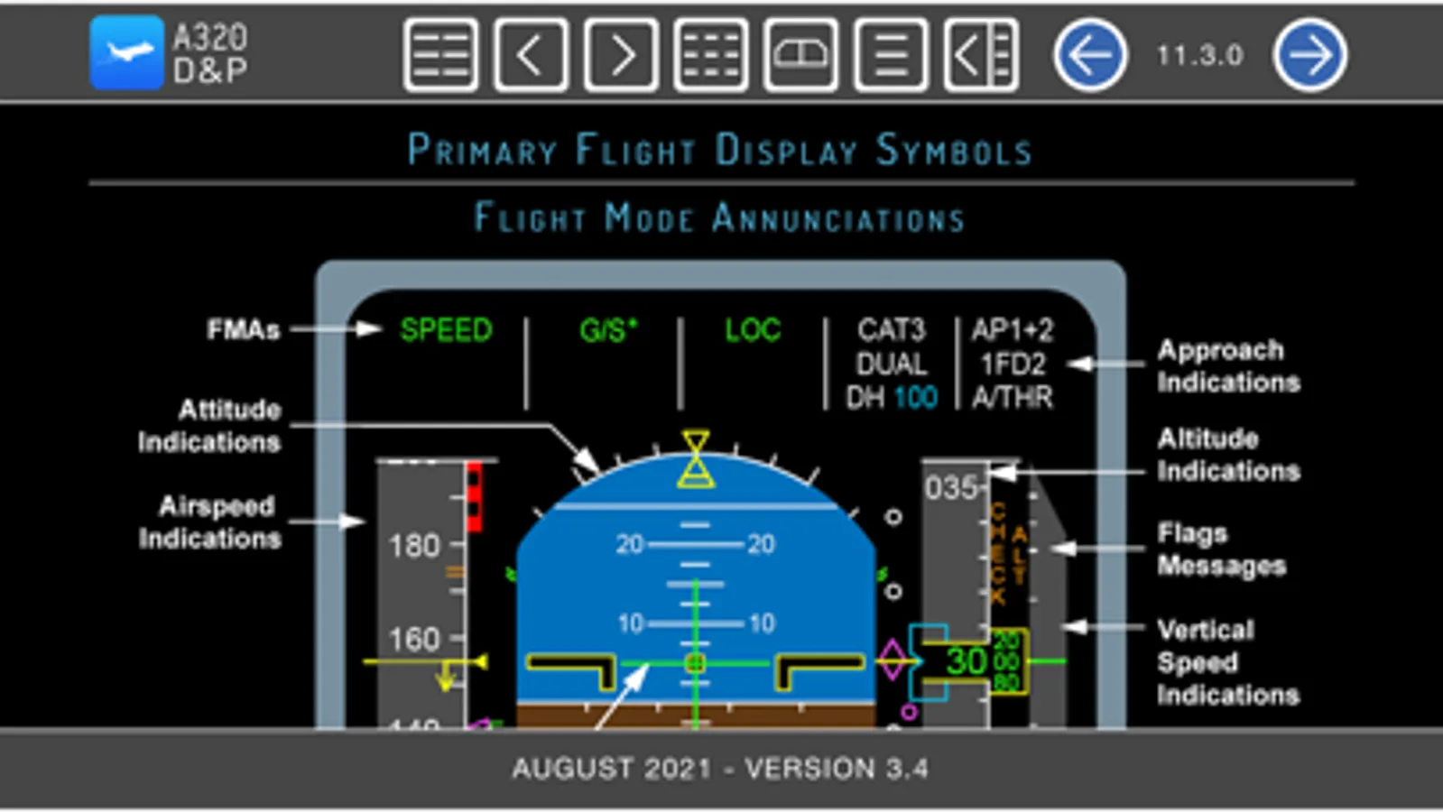 A320 Displays and Panels provides a description of every A320-200 flight instrument, control panel, and display. Includes color graphics of ECAMs, PFDs, ND, E/WD, System Displays, and the MCDU. This unique interactive ebook makes it extremely easy to find information. Just click/tap on any graphic to view details about a switch or control panel. Can be viewed in portrait or landscape view. Section's table of contents can be displayed or hidden. All table of contents and index pages have hyperlinked text. This product is designed for professional pilots who are preparing to transition to the A320-200. Visit our website for a demonstration.