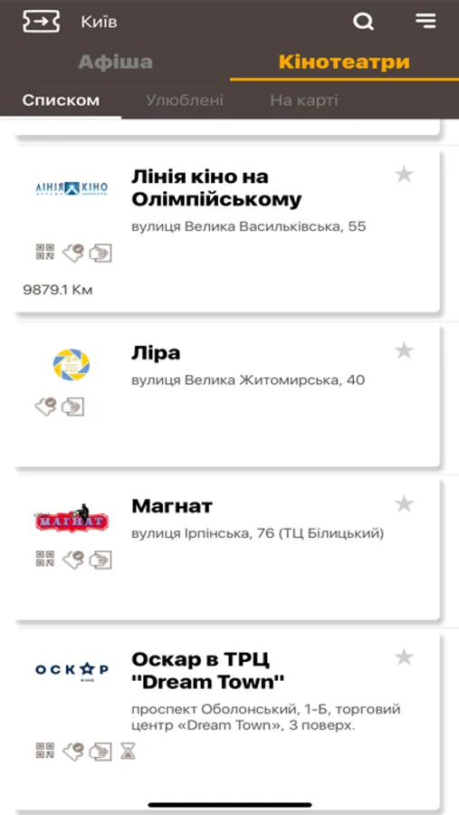 Полная информация обо всех кинотеатрах, просмотр расположения на карте