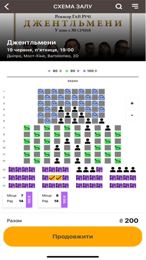 Отображение свободных и занятых мест на схеме зала, выбор мест для покупки