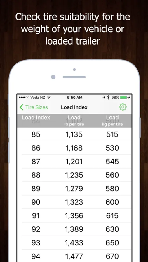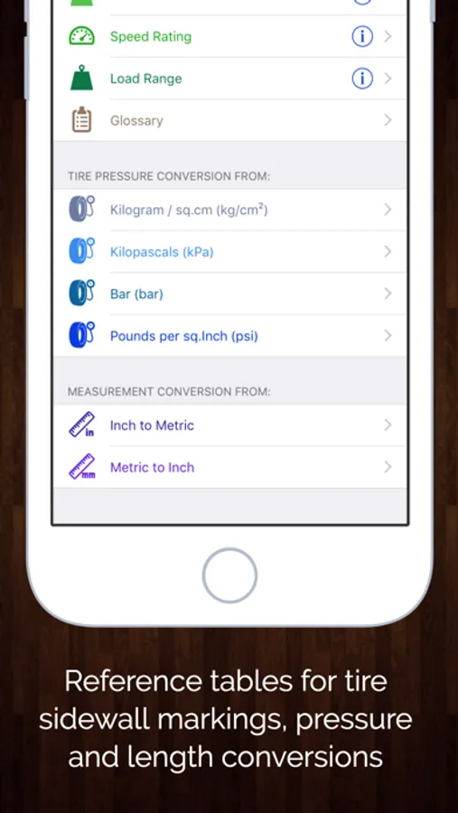 The Tire Sizes app provides tables for calculating the percentage difference in tire sizes when you're looking to replace your tires and/or wheels. It also includes extensive reference material on everything you need to know about your tires, from the information on your tire's sidewall, displayed in both table and glossary format.