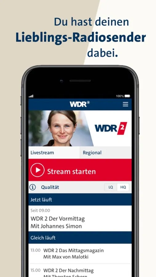 Radio hören, Fernsehen, Informieren – live und überall. Alle WDR Hörfunkprogramme und das WDR Fernsehen auf Ihrem Smartphone oder Tablet. Außerdem erreichen Sie über den Online-Button Nachrichten aus NRW, Wetter und Verkehrsinformationen.