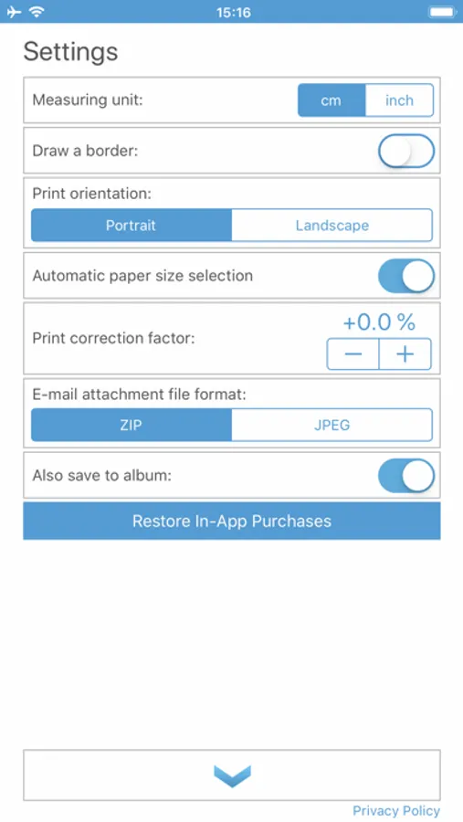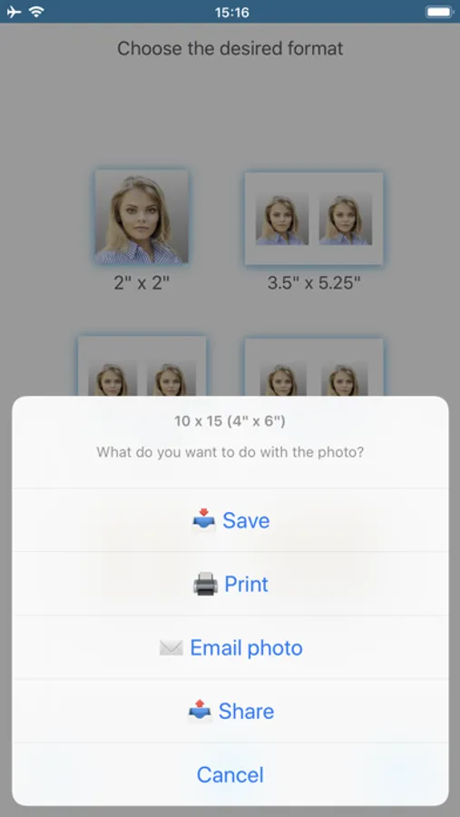 This app supports printing on an AirPrint-compatible printer. The print size can be adjusted in the app if needed. The passport photo will be automatically printed slightly larger in order to facilitate cutting it out.