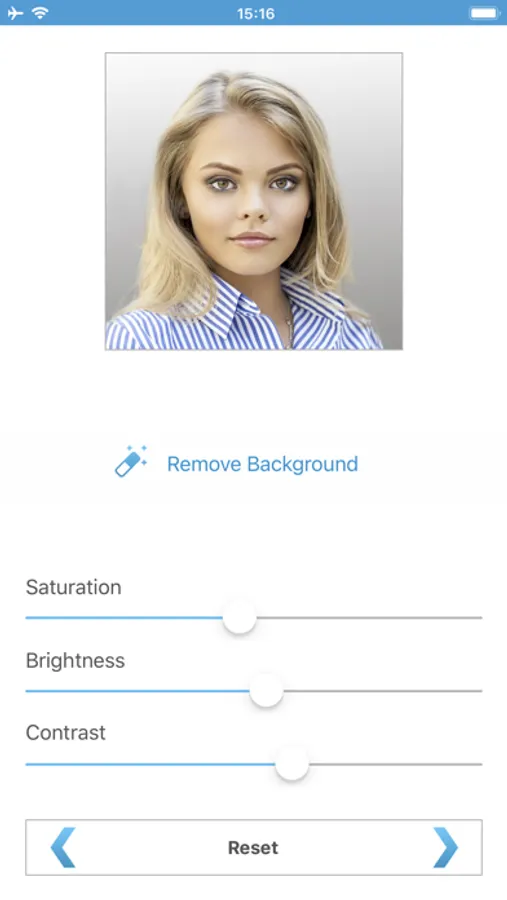 To produce the passport photos, a photo can be taken from the camera or loaded from the album. The next step is to adjust the picture by multi-touch gestures with your fingers (position, zoom and rotation). After that, the saturation, brightness, and contrast can be corrected.