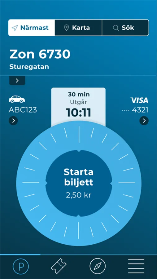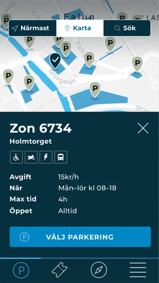 I Faluappen visas närmaste parkeringsområde automatiskt. Det går också att välja område med kartan eller genom att söka på områdets zonkod eller namn. När du har kontrollerat att zonkod och registreringsnumret är rätt, snurrar du fram den sluttid du vill ha på din parkeringsbiljett och startar biljetten. Parkeringsvakterna ser din digitala biljett direkt i sina handdatorer. Om du har notiser aktiverade får du en påminnelse 10 minuter innan parkeringstiden går ut.