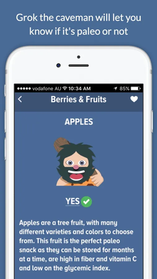 - Intuitive design - a smiling Grok the caveman with a green tick means the food is paleo while a sad Grok with a red cross means it’s not.